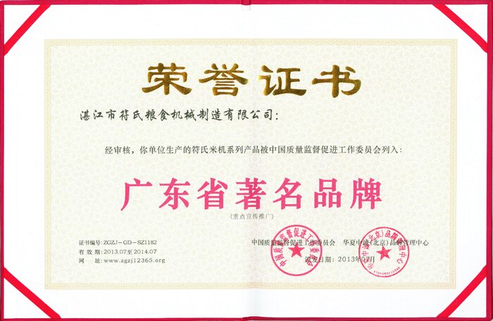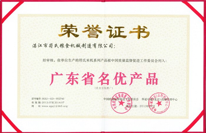 3 2013年被授予“符氏米機系列產品被中國質量監(jiān)督促進工作委員會列入:廣東省名優(yōu)產品”榮譽證書